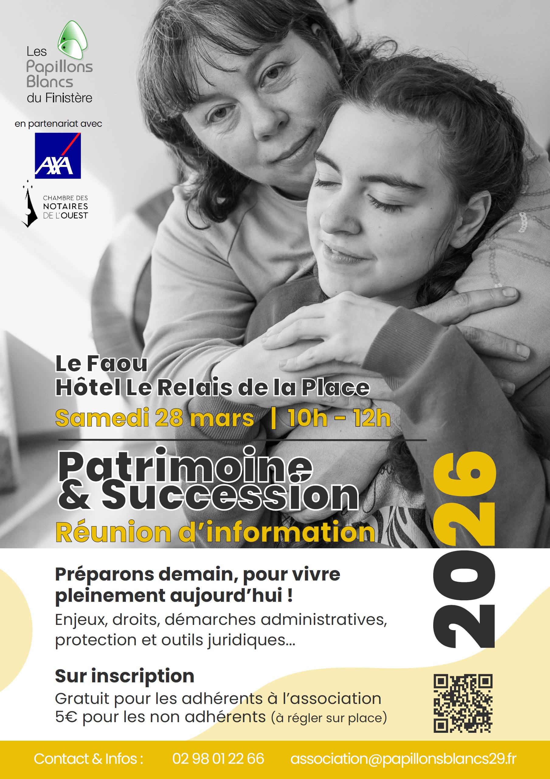 Les Papillons Blancs du Finistère organisent une réunion d’information pour tenter de répondre à une préoccupation récurrente exprimée par les familles accompagnant un proche en situation de handicap : comment anticiper la succession en assurant une protection durable, sécurisée et adaptée à notre proche, tant sur le plan juridique que patrimonial ?